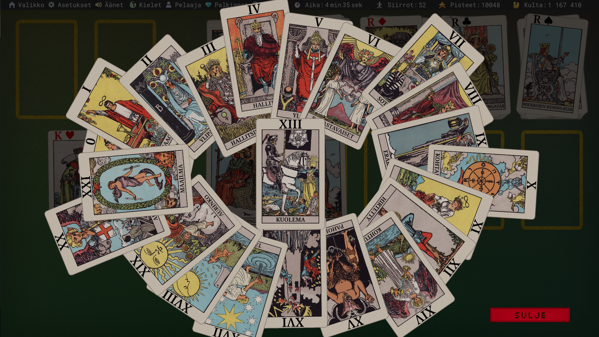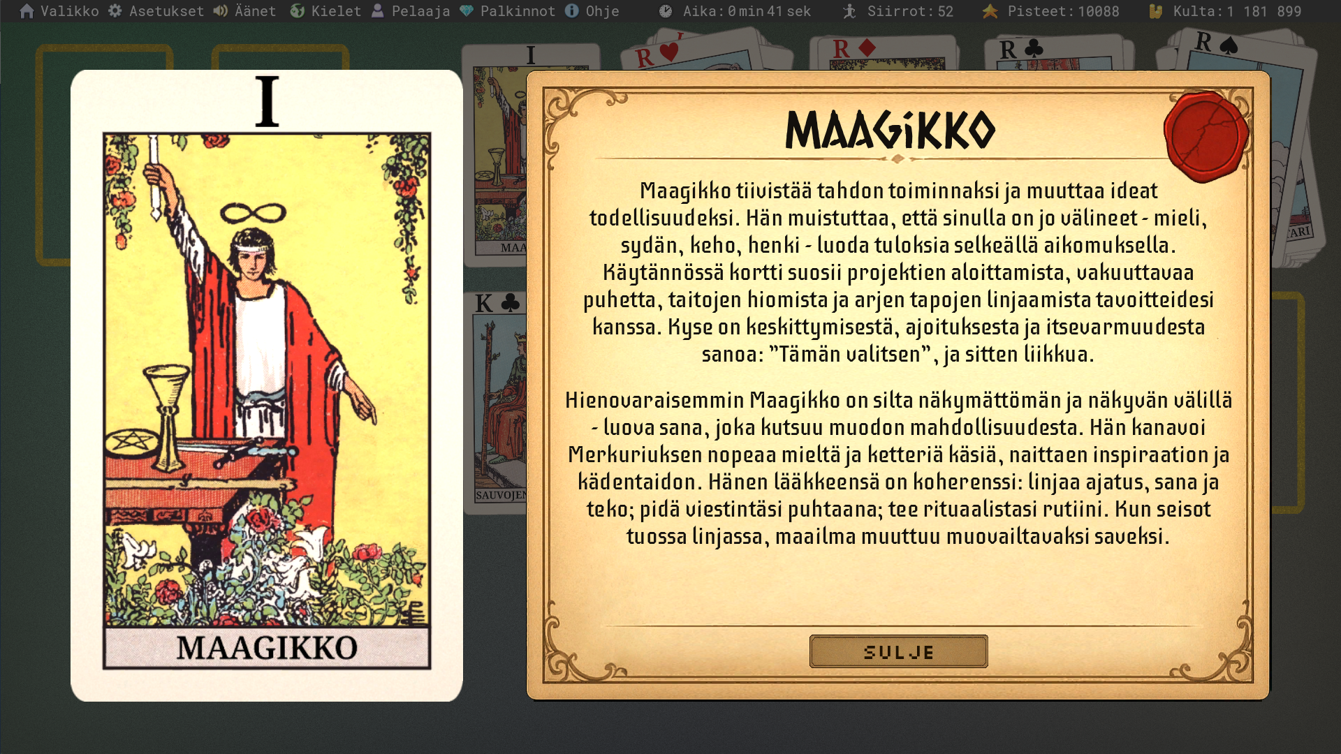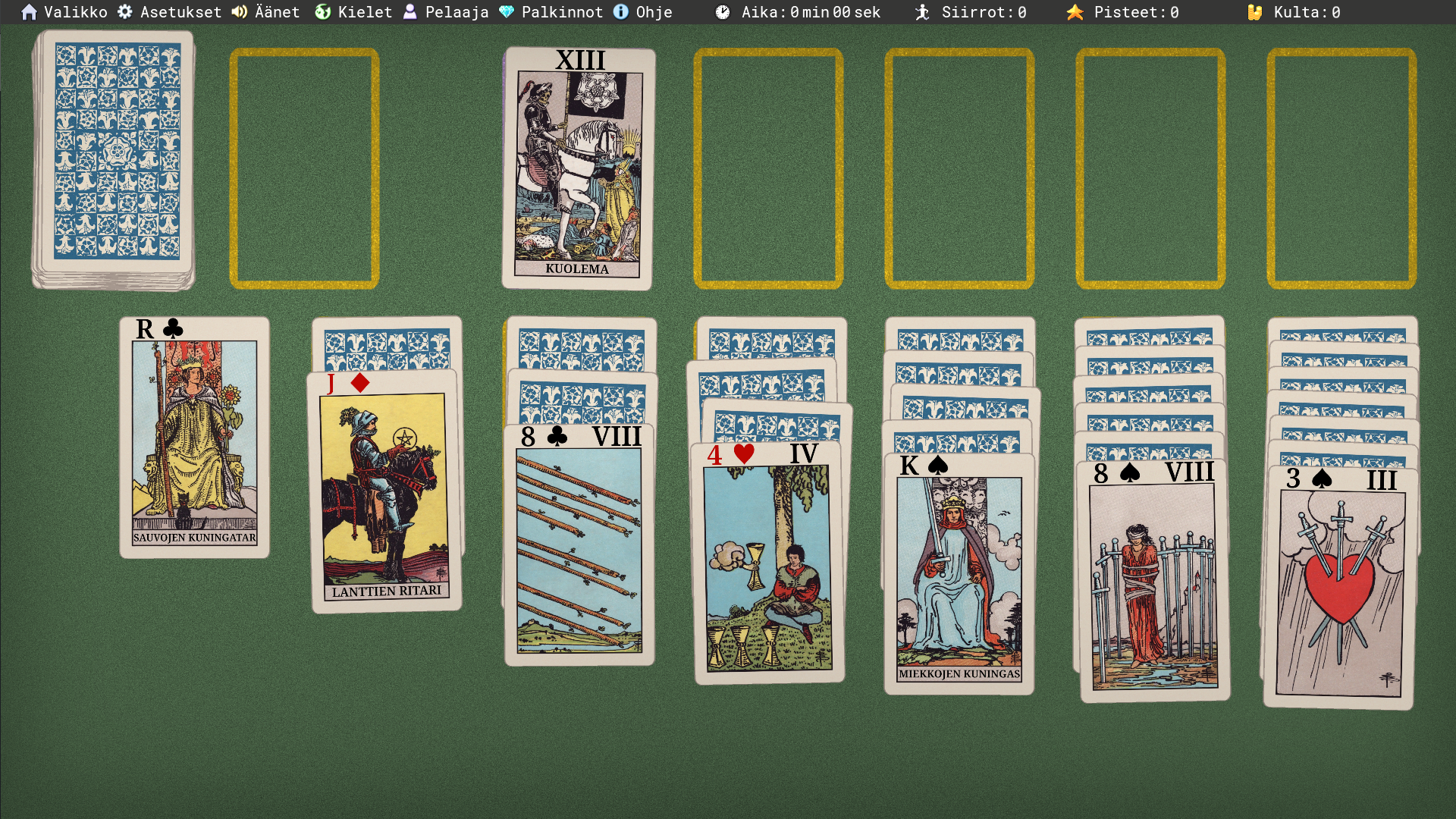 Koe Klondike pasianssi klassisten Tarot korttien kautta. Ansaitse kultaa, haali aarteita, avaa Ison Arkanan kortteja ja jos voitat... lue ennustuksesi.