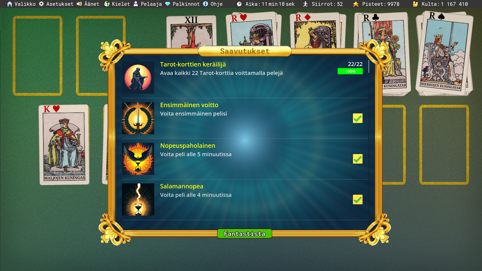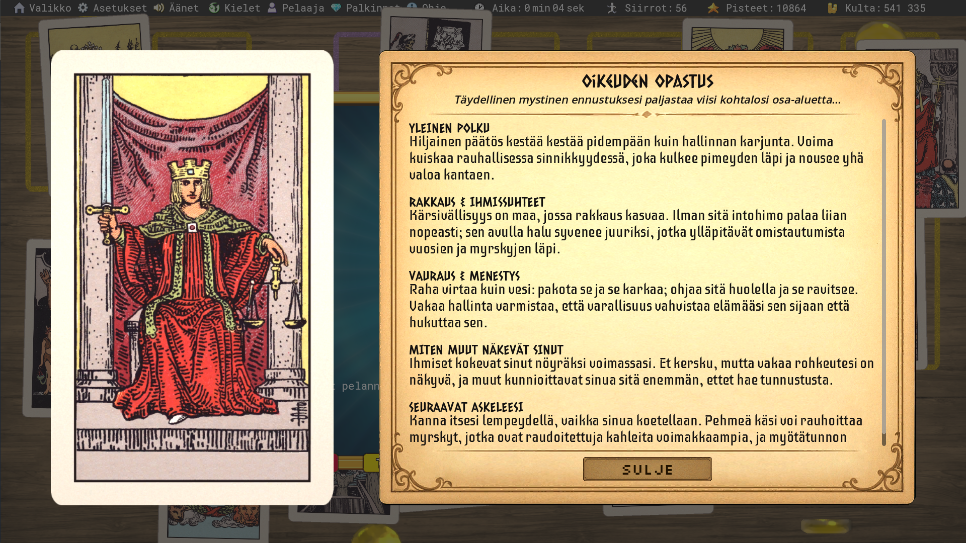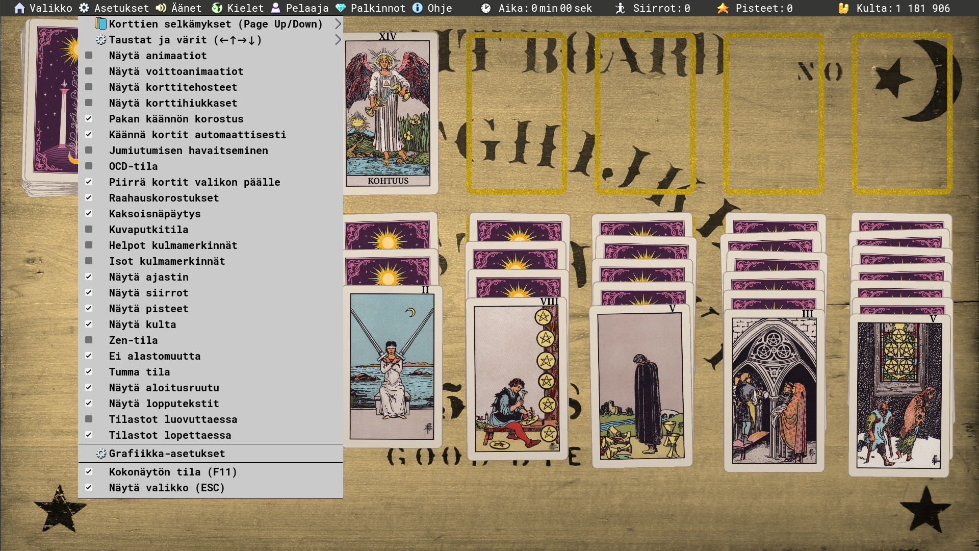 Koe Klondike pasianssi klassisten Tarot korttien kautta. Ansaitse kultaa, haali aarteita, avaa Ison Arkanan kortteja ja jos voitat... lue ennustuksesi.